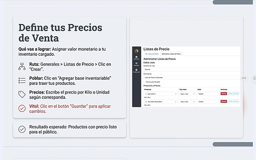 Las listas de precio te permiten definir el valor por kilo o por unidad para cada producto. Puedes tener listas distintas por tipo de cliente o por necesidades del negocio.