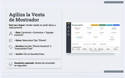 Para ventas simples de mostrador, lo más eficiente es vender a un cliente genérico. Solo pides datos completos cuando el cliente necesita factura electrónica (se explica en otra guía).